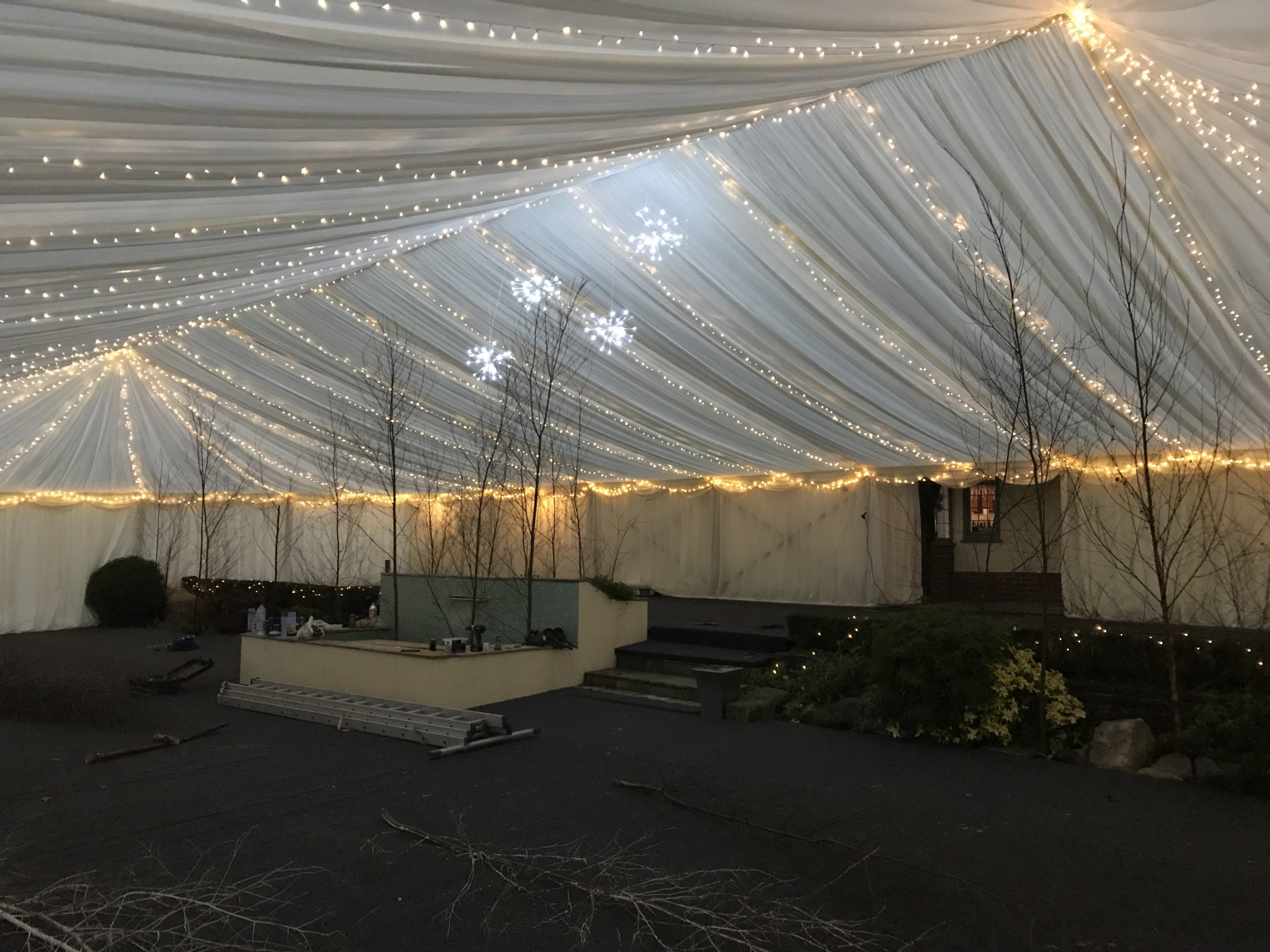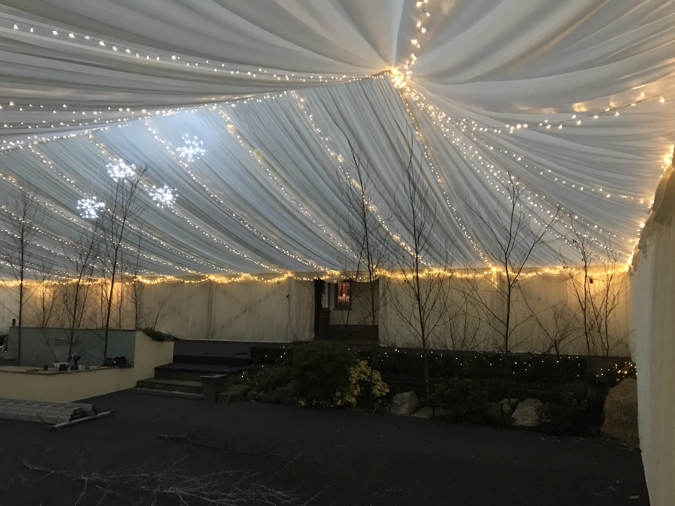 We can also supply a star cloth roof lining to go above the dance floor in your marquee. This works as a blackout lining, perfect for those light summer evenings when you want to get on with the dancing. It also features hundreds of tiny “star” lights, which can be set to various speeds, patterns and brightness, to make your dance floor area look amazing. We can also supply star cloths to line the entire roof and or walls if required.